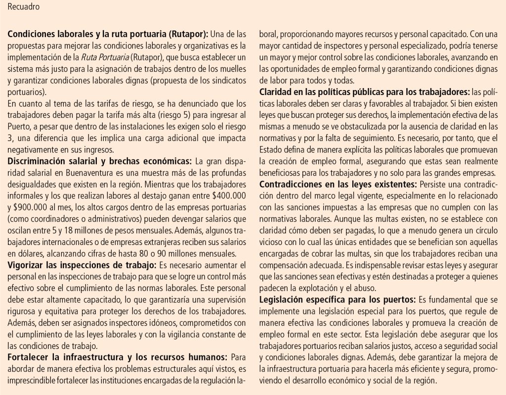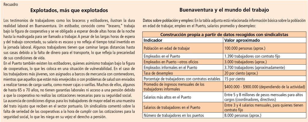 El caso de los trabajadores subcontratados, como los estibadores, es particularmente grave. Ellos operan bajo la figura de cooperativas y tercerización, colocados en una situación de total vulnerabilidad. A menudo deben esperar largas horas para que les asignen una tarea y, aunque su jornada laboral es extensa, su salario es muy bajo y no refleja el tiempo total de trabajo. Muchos de ellos ni siquiera tienen garantizados los derechos básicos laborales, como seguridad social y prestaciones. Sobre el particular, Petronilo Garcés, uno de los tantoscoteros de oficio que trabajan en el Puerto, ante nuestra pregunta de cómo es si jornada diaria, comenta: “Cada día me levanto a las 4 am,y al mismo tiempo mi esposa, quien prepara el desayuno y el almuerzo para mi jornada. Salgo a pie hacia el Puerto y allí me toca esperar hasta las 8:00 am para iniciar labores, en ocasiones sin certeza de cuándo comenzará. Dependo de una cooperativa –de esas que tercerizan oficios– quien me dice lo que toca hacer cada día en el muelle.