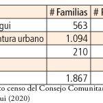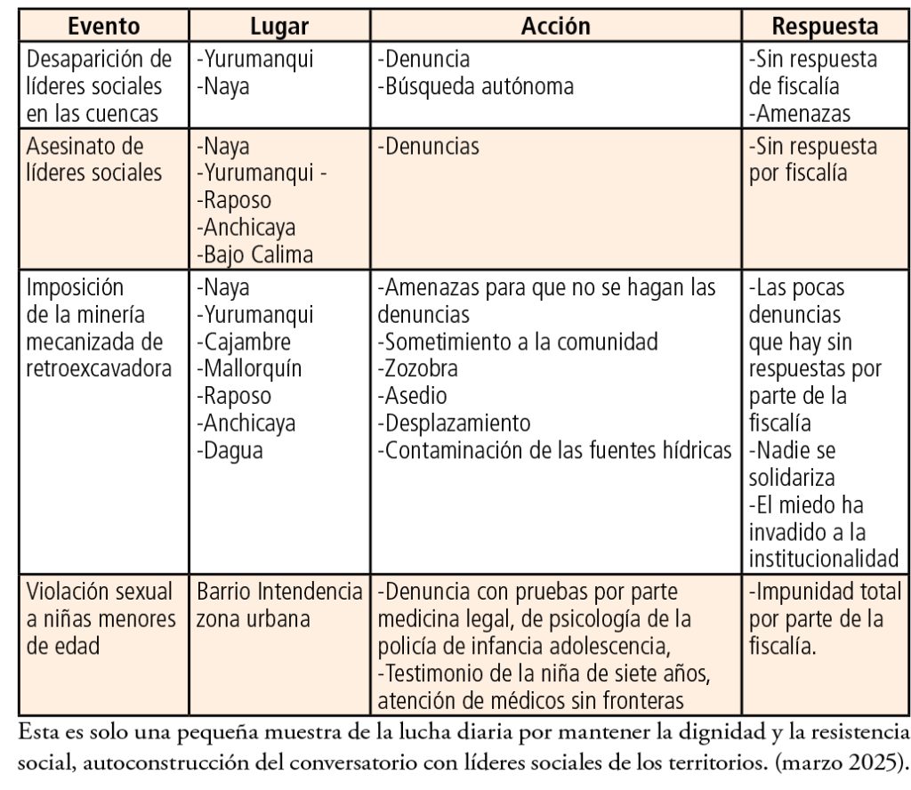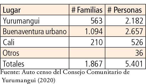 Es lo que está sucediendo en los territorios ancestrales, por ejemplo el consejo comunitario de Yurumanqui, uno de los más fuertes en organización social y lucha por la dignidad de su gente y su territorio, y que en la actualidad está siendo literalmente vaciado: para el año 2020, la cuenca en que está situado contaba con 10 comunidades y 5.401 personas y en la actualidad solo permanecen 2.182, las demás han sido desplazadas hacia diferentes lugares, Buenaventura, Cali, y otras ciudades, grandes o pequeñas. Resumimos esta realidad en el cuadro siguiente: