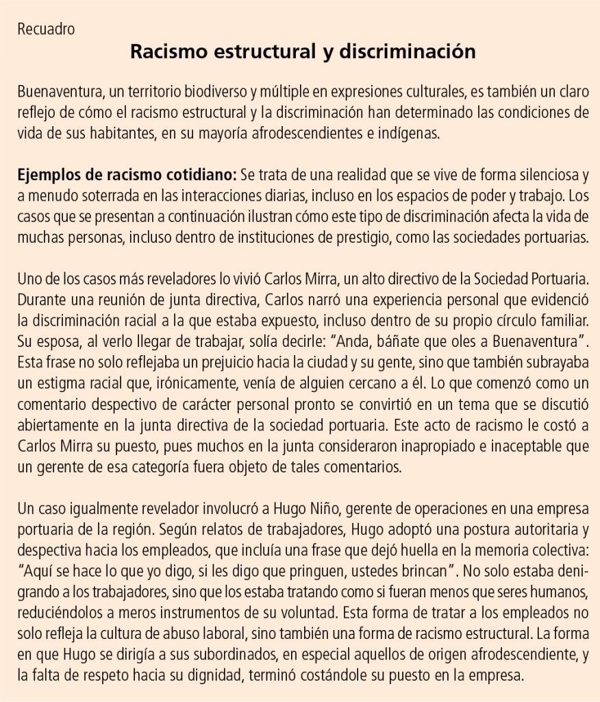 La discriminación también es un tema clave. Las mujeres afrodescendientes y rurales tienen acceso limitado a trabajos formales y bien remunerados, a pesar del crucial papel que juegan en la economía local. Además, las comunidades étnicas, como las del Bajo Calima, enfrentan la negativa de las grandes empresas a contratarlas para puestos de alto rango, escudados en que no tienen la formación adecuada para asumir cargos operativos o administrativos, lo que perpetúa la exclusión laboral de estas comunidades.