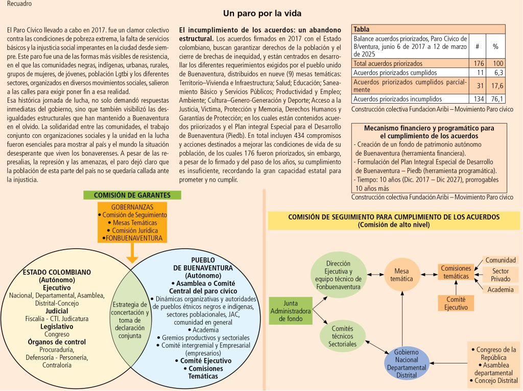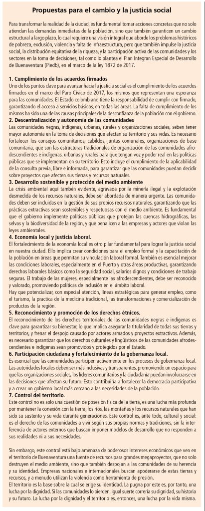 Las organizaciones comunitarias: un frente unido en la lucha. En Buenaventura 244 organizaciones comunitarias registradas en la ciudad, con un liderazgo local reconocido en áreas como medio ambiente, educación, derechos humanos, servicios públicos, entre algunas de las áreas de su actividad, han sido fundamentales en la defensa del territorio y los derechos de las comunidades negras e indígenas. Estas organizaciones han estado en la primera línea de denuncia de las injusticias que afectan a la población, especialmente en lo que respecta a la falta de acceso a servicios esenciales y el despojo de tierras por parte de empresarios y actores ilegales de todo tipo. Además, han jugado un papel crucial en la articulación de las demandas de las comunidades ante el Estado, exigiendo el cumplimiento de los acuerdos firmados y luchando por el reconocimiento de los derechos de las comunidades afrodescendientes e indígenas, y demás pobladores de la ciudad puerto. Sus iniciativas han sido esenciales para que los reclamos de los bonaverenses se escuchen y se reconozca la magnitud de las injusticias que enfrentan.