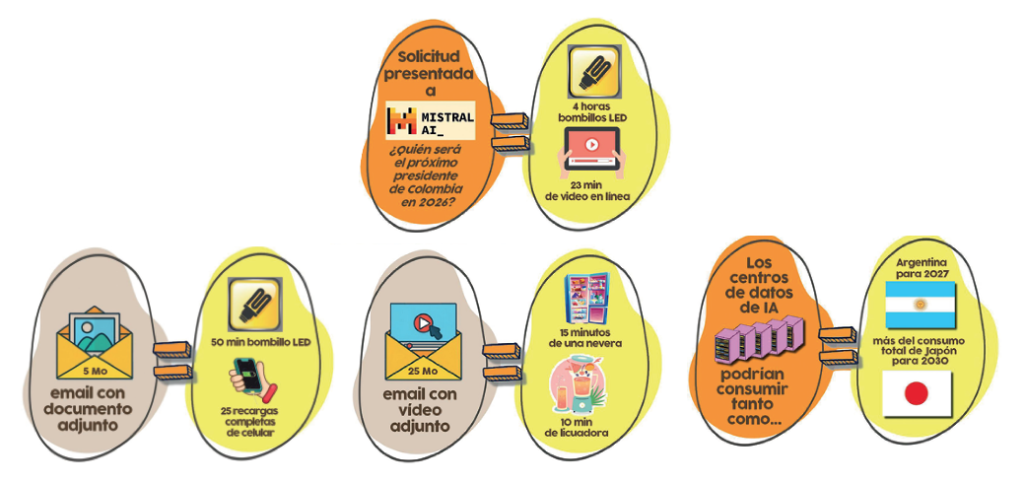 • IA, factor de amplificación: El auge de la IA, con sus enormes demandas computacionales para entrenar modelos y ejecutar algoritmos, intensifica significativamente el consumo de energía. Su complejidad y ubicuidad en nuestras actividades diarias (buscar, traducir, crear contenidos) lo hacen particularmente insidioso, porque oculta su consumo de energía detrás de una fachada de ligereza e inteligencia.