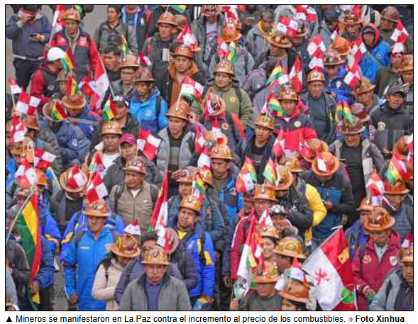 La Paz. Una enorme y ruidosa marcha de mineros congestionó ayer las calles del centro de La Paz, mientras en otras ciudades de Bolivia se realizaban protestas durante el primer día de huelga de trabajadores convocados en rechazo a la abolición de los subsidios a los combustibles por parte del nuevo gobierno del presidente Rodrigo Paz.