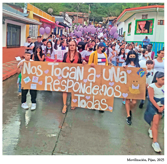 Somos parte de la alianza de protección ambiental en el departamento y el estado, combinando la condena pública y judicial con la pedagogía. “Nuestro trabajo no es sólo de denuncia”, aclaramos, sino también de “viajes ecológicos para reconocer el territorio, sus aguas y su biodiversidad”. Plantamos cientos de árboles indígenas y durante dos años acompañamos a la Asociación de Mercados Campesinos de Calarcá, apoyando en la logística, realizando 14 mingas comunales en fincas de mujeres y ayudando en los trabajos de campo, siempre acompañados de café, comida compartida y tertulias.