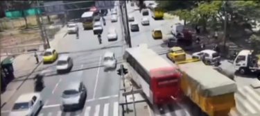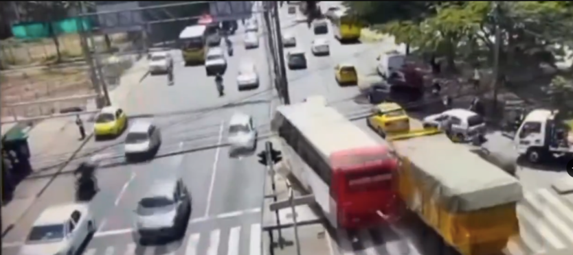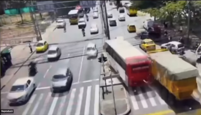 Las cámaras de vigilancia de la zona captaron el momento en que el camión volquete, que habría quedado sin frenos, perdió el control e impactó contra varios turismos y un autobús de transporte público.